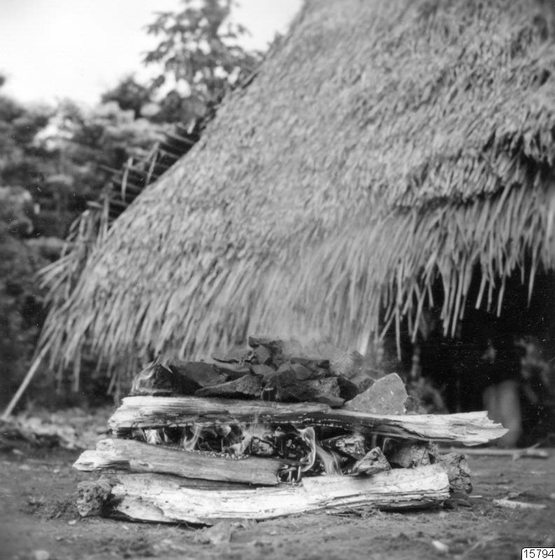 Motiv: Två fotos till etnografisk samling 1966.9. (se originalfotolistans 17-18 i bilaga till originalkatalog för 66.9.) : Icke täckt stenugn och stekning av sköldpaddor i sådan ugn. Saml. anser i etnografisk litteratur förekommande benämning "jordugn" fel, det är jordtäckta stenugnar. Kvinnorna brukar ordna med stekning.