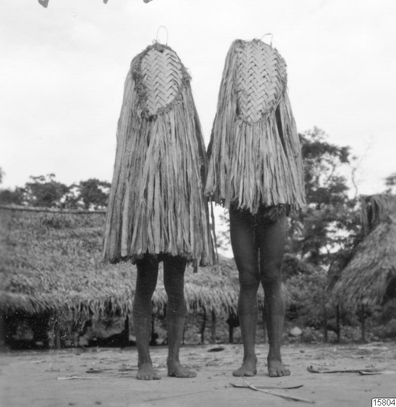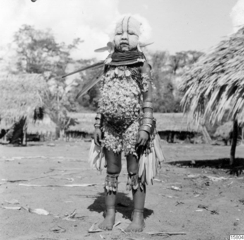 Motiv: Två fotos till etnografisk samling 1966.9. (se originalfotolistans 35-36 i bilaga till originalkatalog för 66.9.) : Apmasker, se kat. nr. 66.9.50.; fjädersmetad flicka vid kvinnofest. Se kat. nris 66.9.59 och 65 a-b för hennes prydnader. Jämför bild 15797, negativ 9907.