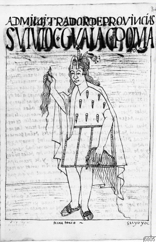 Motiv: Quipu-försedd fogde. Sid. 348 i Guaman Poma de Ayalas manuskript i Köpenham. (Facs.upplaga, Paris 1936).