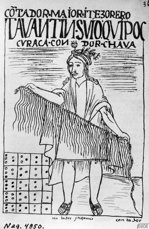 Skiss av en Quipucamayoc från El Primer Nueva Corónica och Buen Gobierno (Den första nya krönikan och god regering), en krönika över Inkas historia av den inhemska krönikören Felipe Guaman Poma de Ayala (ca 1535-1616).