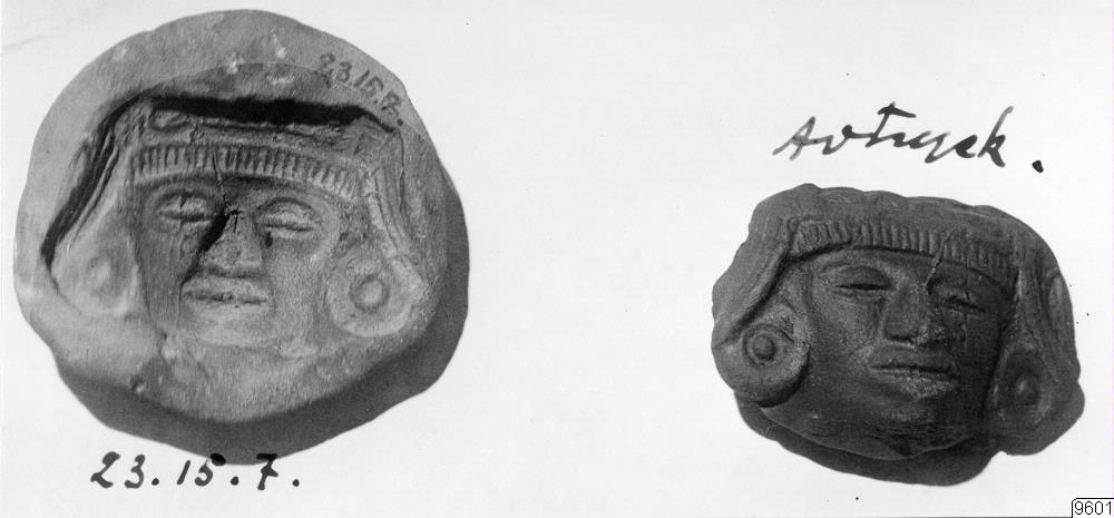 Motiv: Form för gjutning av ansiktsfigur. Kat.nr. 1923.15.0007. Anträffad 1,5 m under markytan. Avtrycket ur formen gjort av Dr S. Linné. Arkeologi.