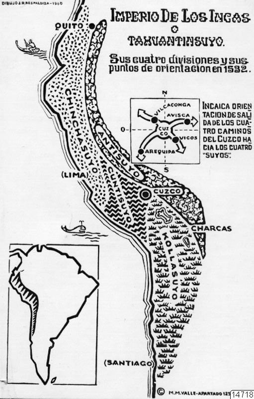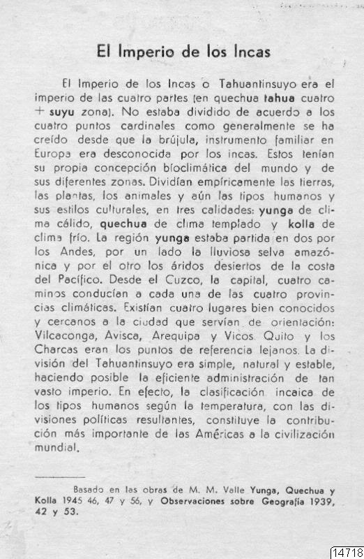 Motiv: Översikt över Inkariket, vykort med text publicerat i en serie av M.M. Valle och efter framställningen i hans bok: "Yunga, Quechua y Kolla", ävenså arbetet av samme förf.: "Observaciones sobre Geografica".