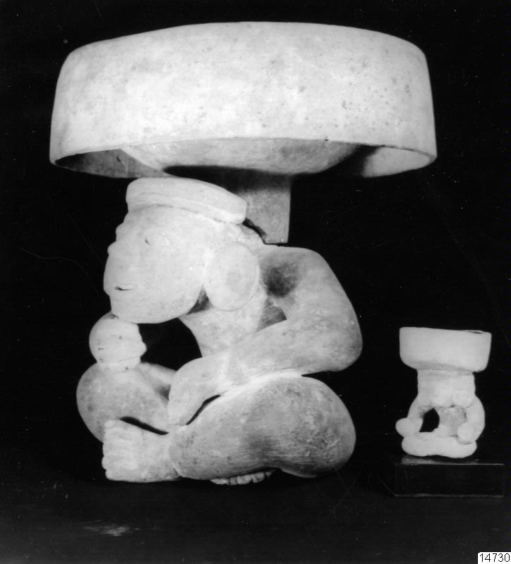 Motiv: Tre fotos av 33 cm hög incensario av lergods med avtagbar skål. Figurmotiv Huehuetéotl, Eld-guden, "Den Gamle Guden". Föremålet tillhörde vid tiden för publicering (se nedan) antikhandlaren Earl L. Stendahl, Los Angeles.