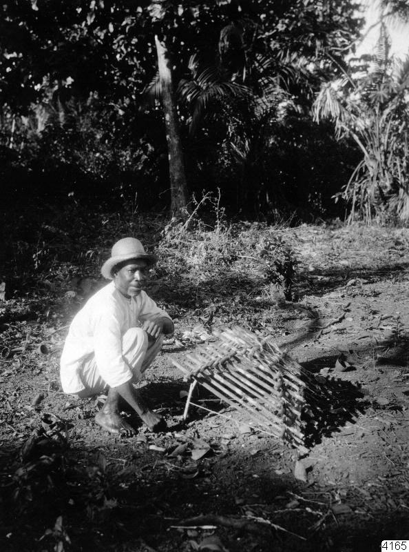 - En man gillrar en duvfälla.