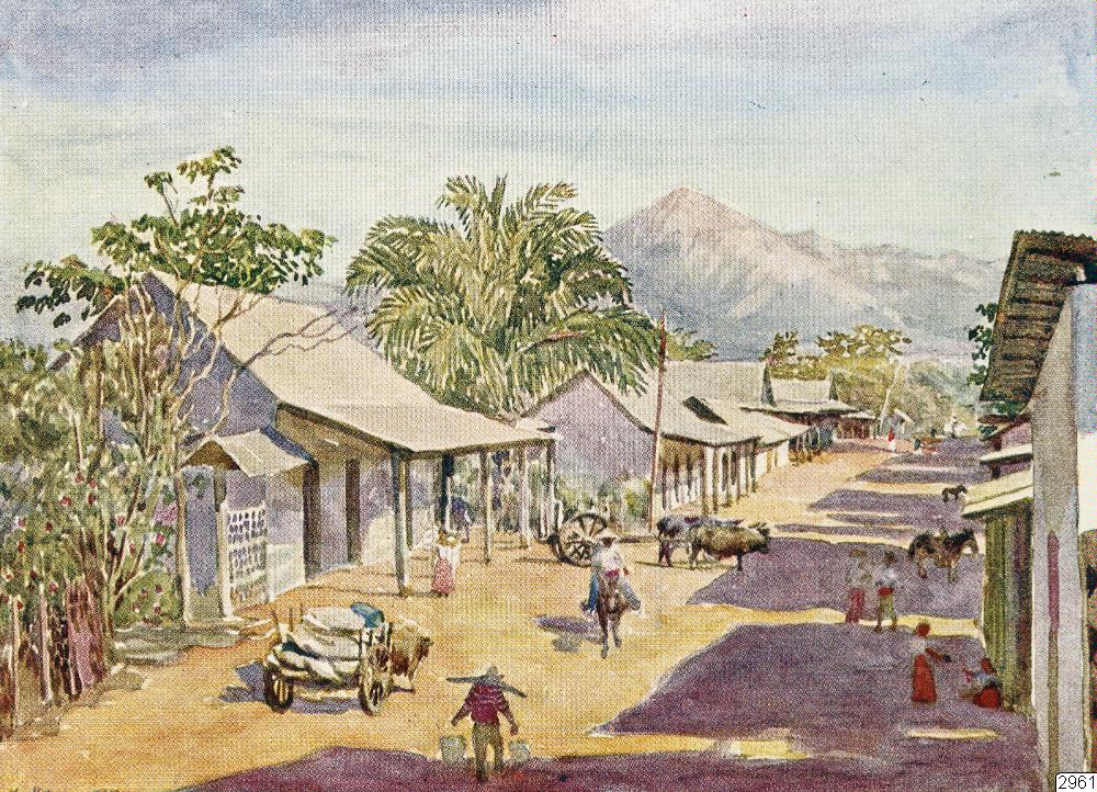 Motiv: vykort efter målning av Max Vollmberg. Motiv: Byscener och haciendas.