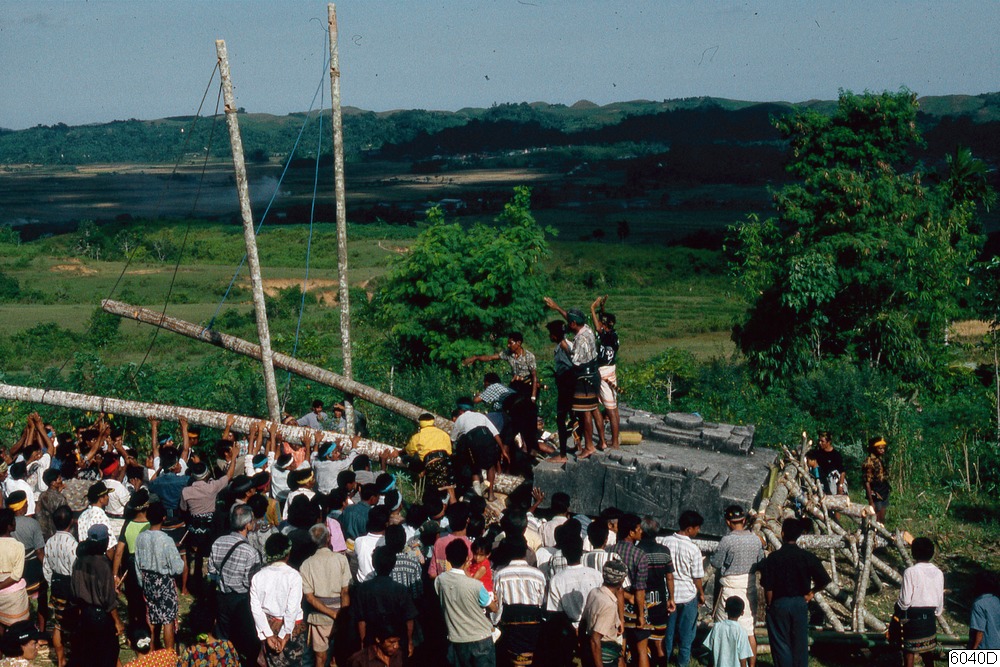Män öppnar locket på megalitgraven. Kampung Gollu Potto, Desa Sobawawi, Västra Sumba, Indonesien