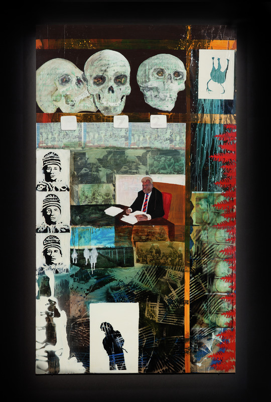 Sunna’s painting New Methods, Same Abuses brings up a variety of issues: the rights of indigenous peoples, racist structures, the Samis’ history and struggle for civil rights, and the issue of who is entitled to use land and for what.