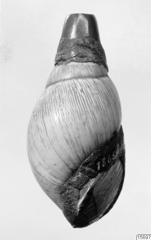 Förvaringsdosa av snäcka, No 1215 från Etnografiska museet, Oslo. 1 av fyra bilder.