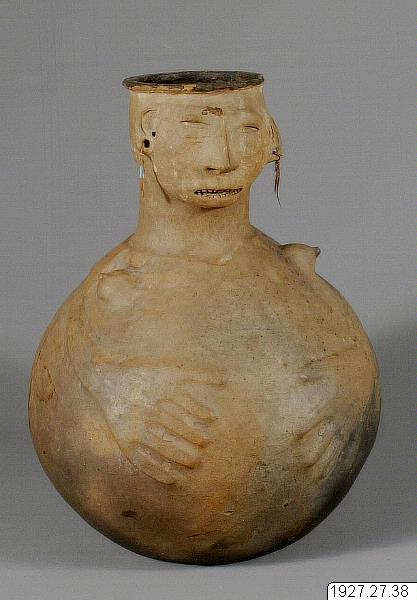 - Lerkärl, ansiktsurna med örhänge av pärlemor. (katalogkort/originalbeskrivning)