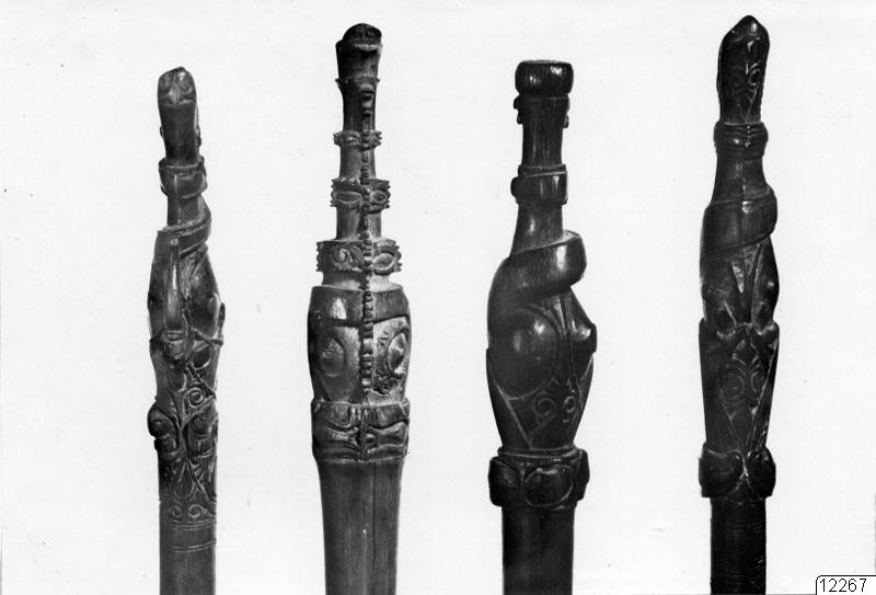 Kniv med långt i överdelen rikt utskuret träskaft. Att skära av ris med. Skaftets nedre del lindad med fibrer.