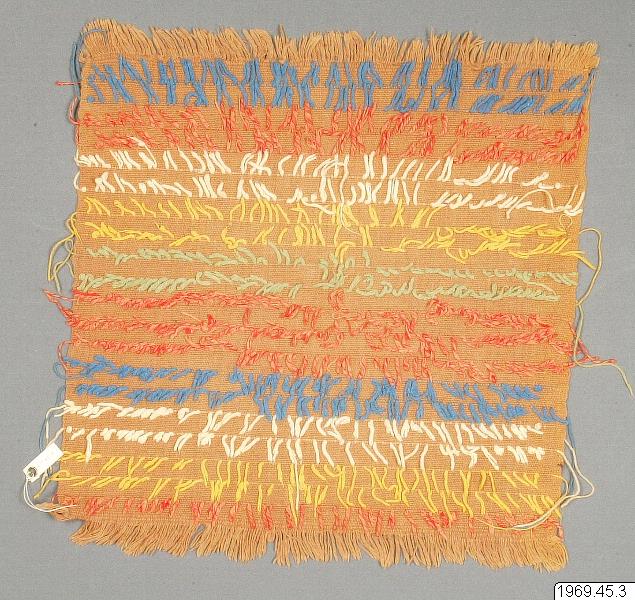 Servett i naturbrun bomull s.k. chivo, med trådar i blått, rött, vitt, gult och grönt som dekoration. Mått: 23 cm x 33 cm. Lilly de Jongh Osborne skriver om denna textiltyp i arbetet Indian Crafts of Guatemala and El Salvador p. 118 följande: " A sevilleta known as chivo (goat) is a