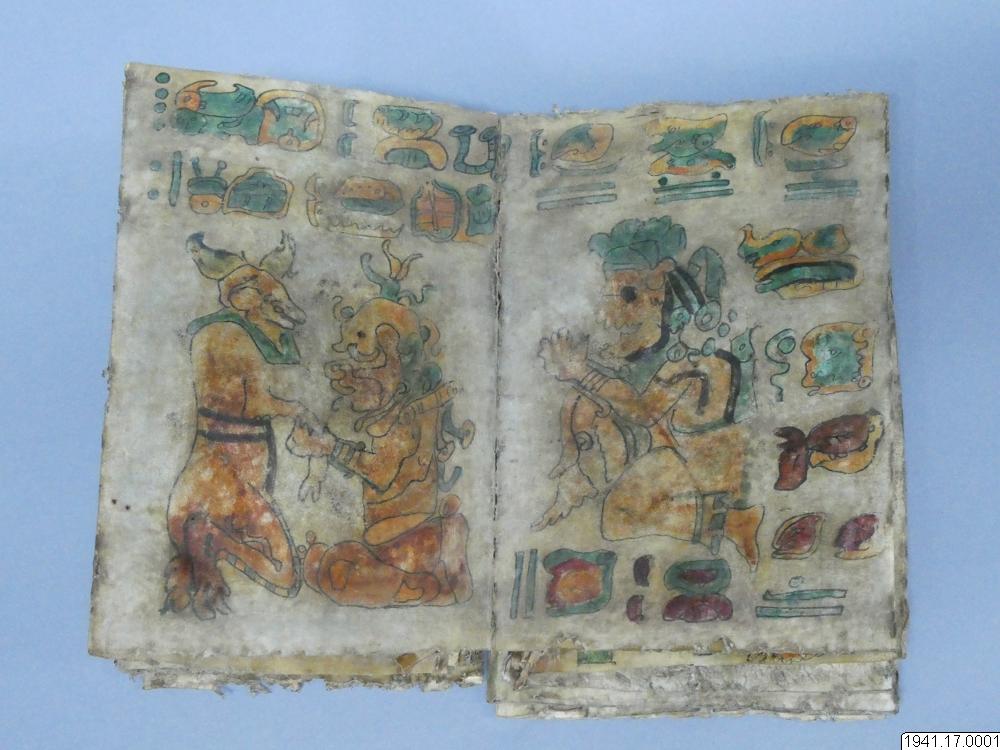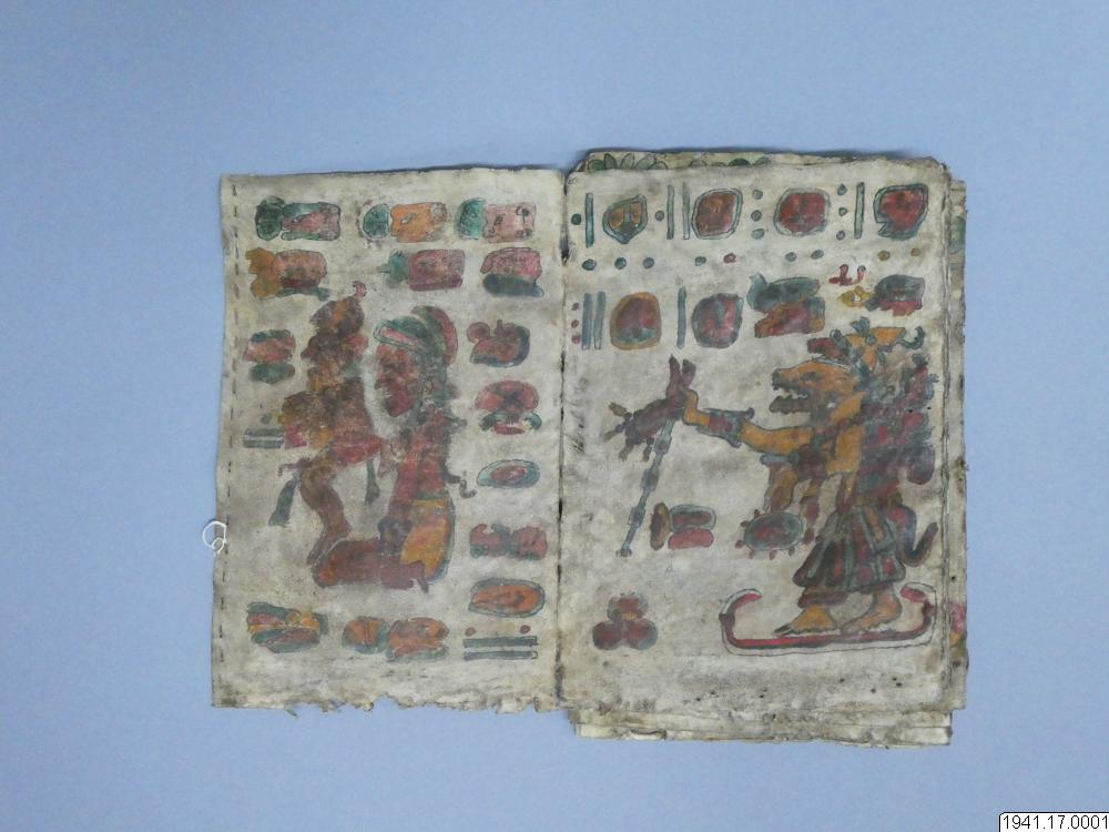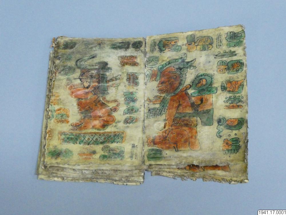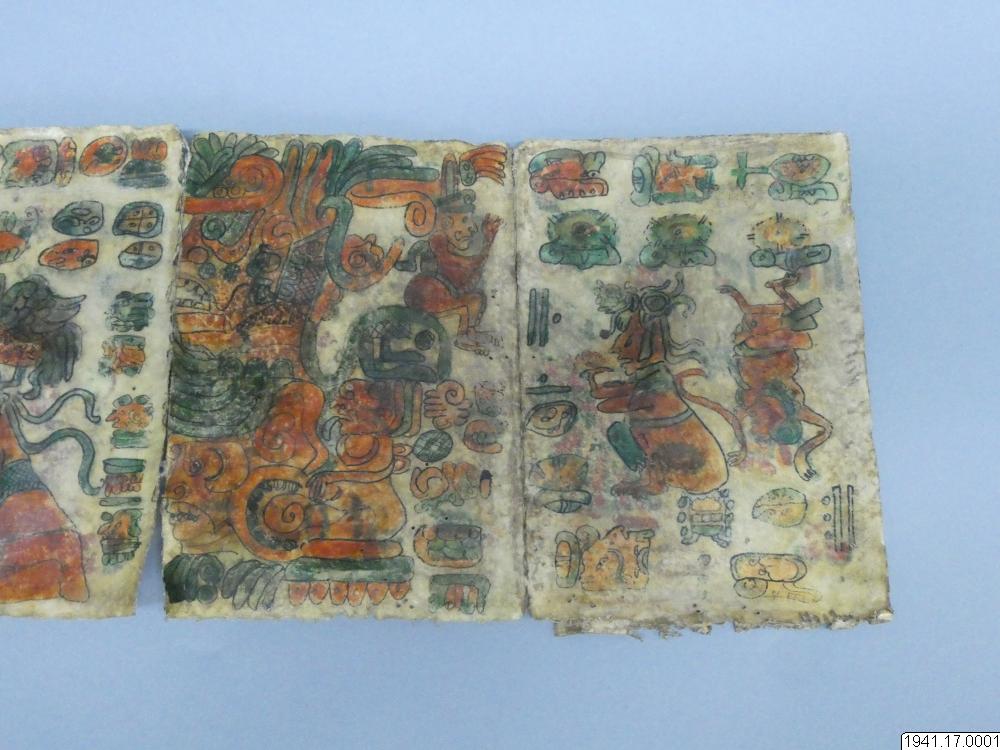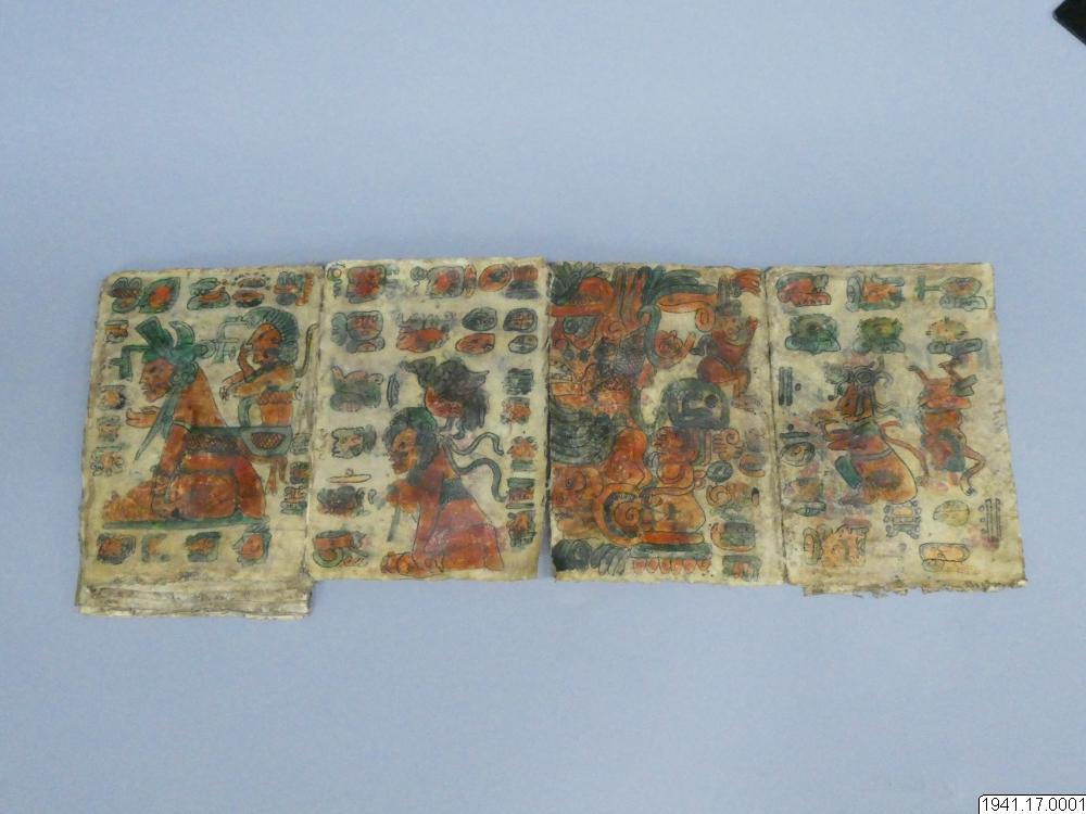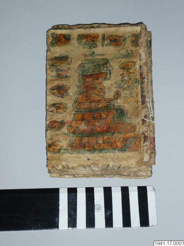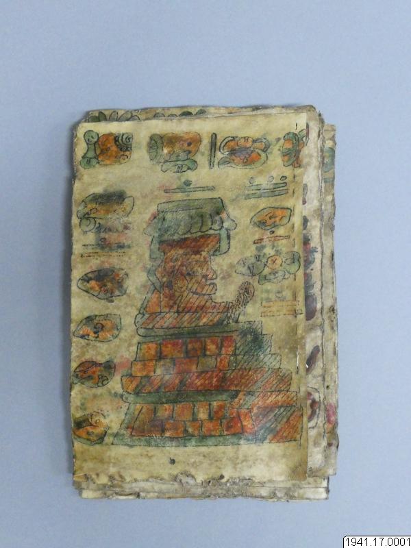 Med figurer och datumhieroglyfer m.m. målat dokument på skinn om 20 veckade och hopfasta blad (40 sidor) i storlek c:a 15,5 x 17 cm. Se vidstående text!