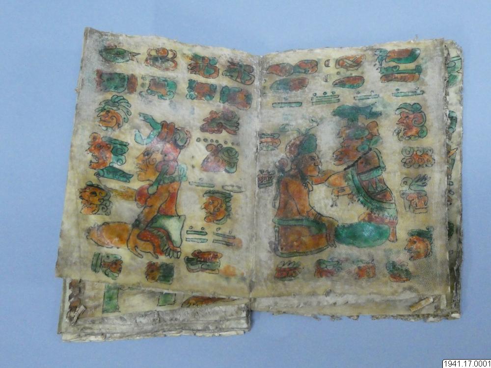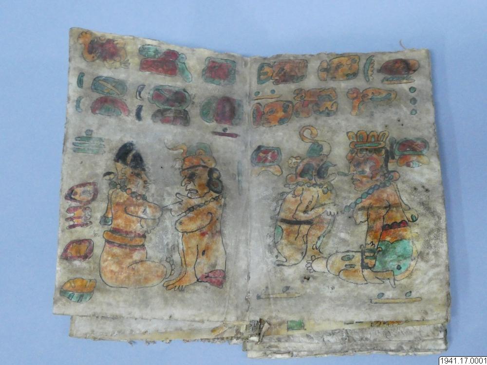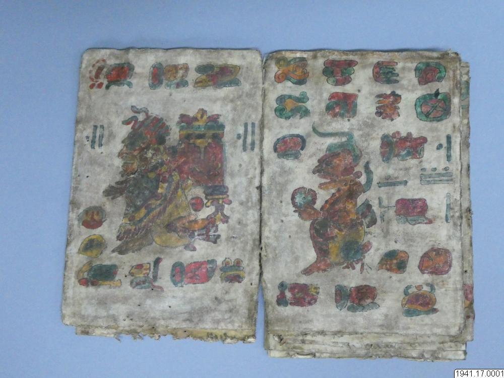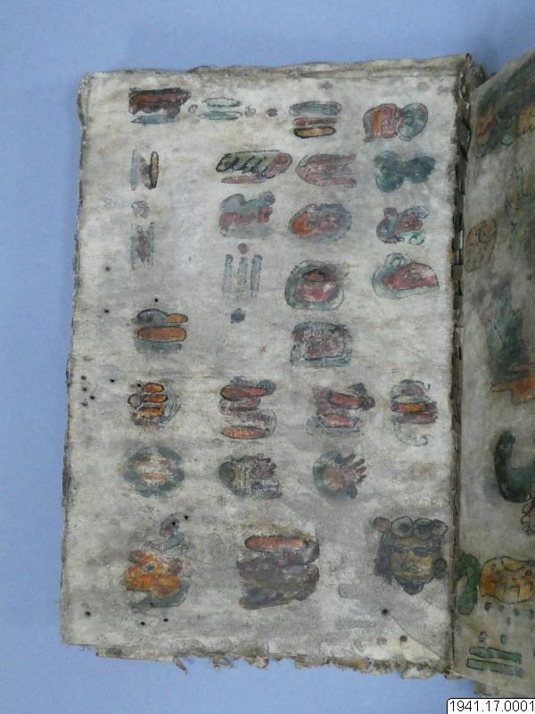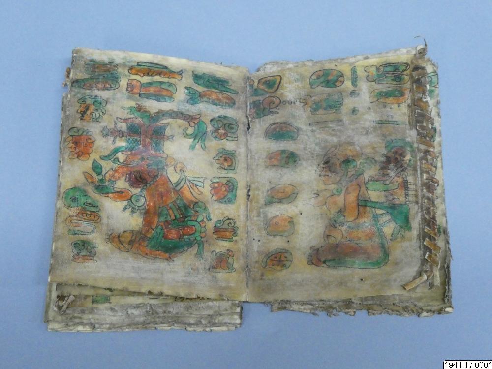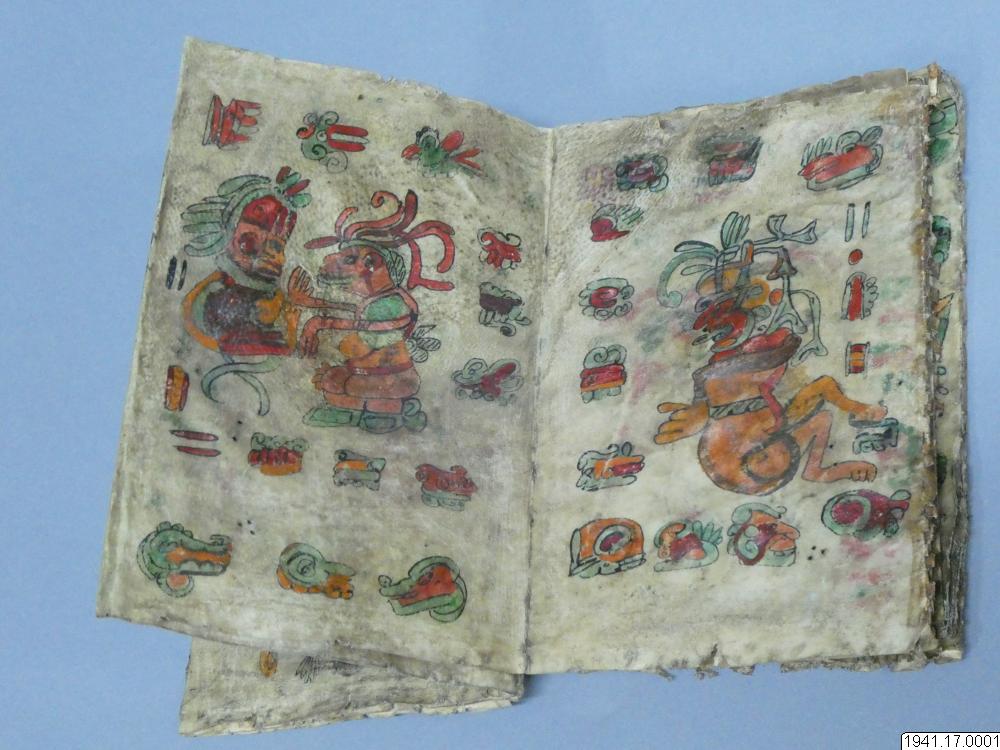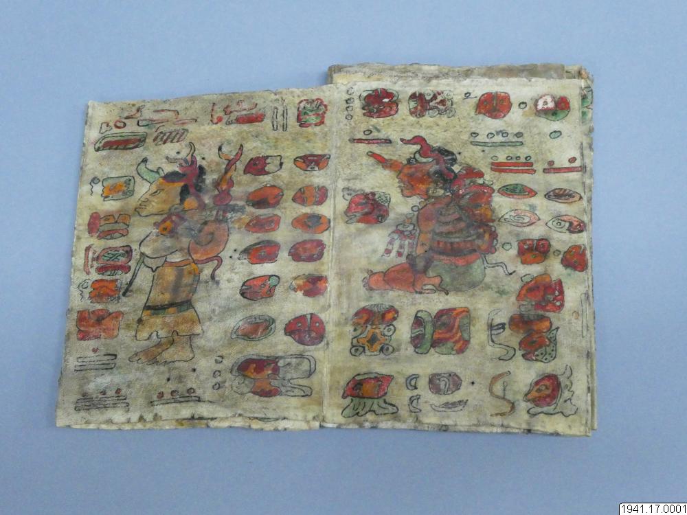 Med figurer och datumhieroglyfer m.m. målat dokument på skinn om 20 veckade och hopfasta blad (40 sidor) i storlek c:a 15,5 x 17 cm. Se vidstående text!