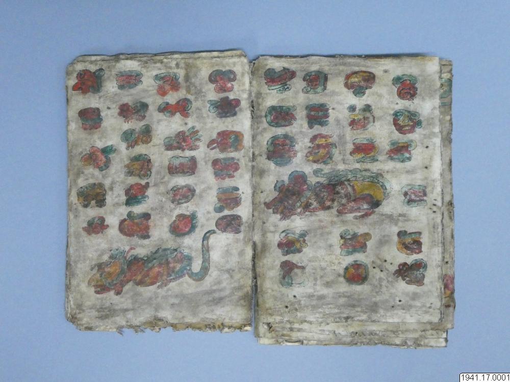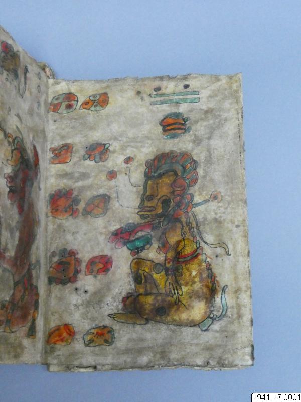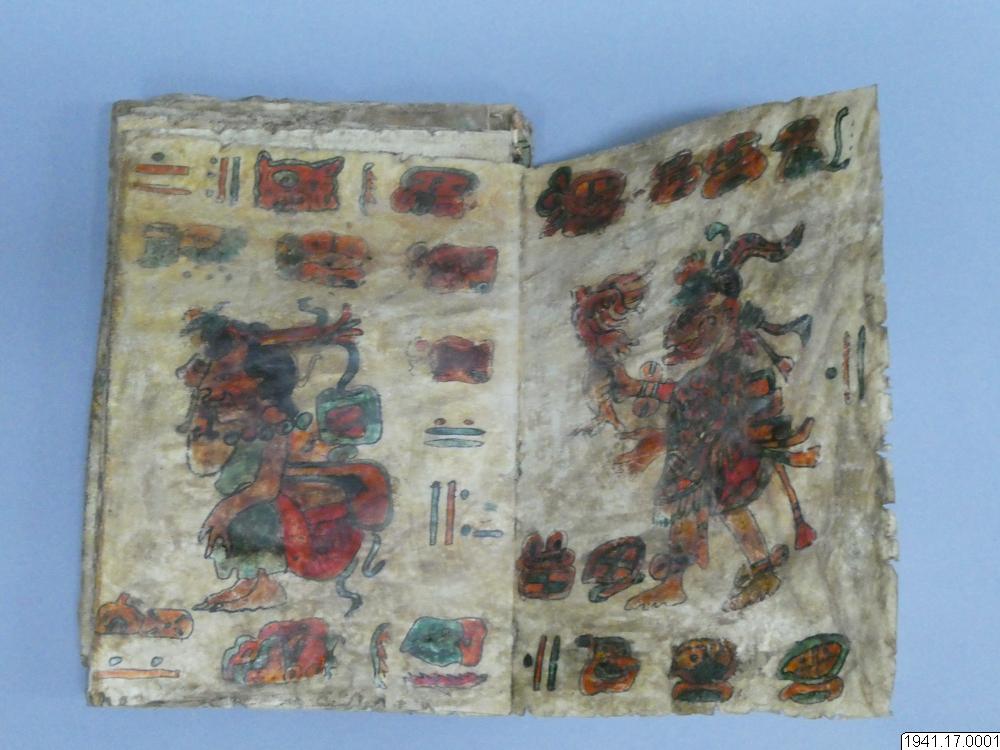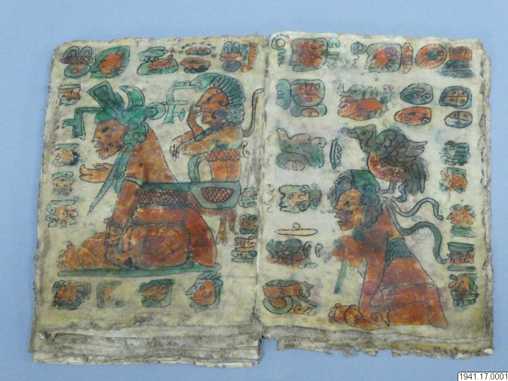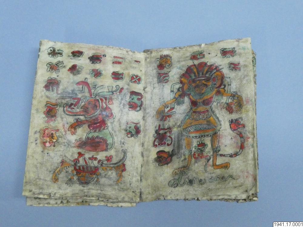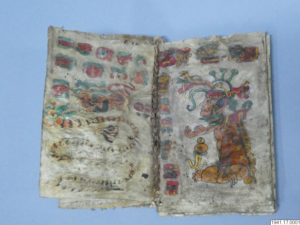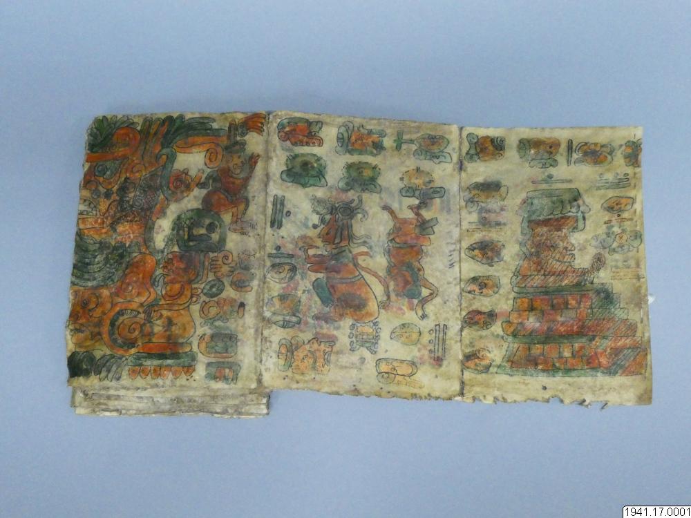 Med figurer och datumhieroglyfer m.m. målat dokument på skinn om 20 veckade och hopfasta blad (40 sidor) i storlek c:a 15,5 x 17 cm. Se vidstående text!