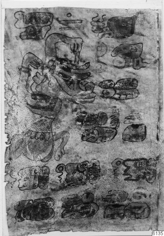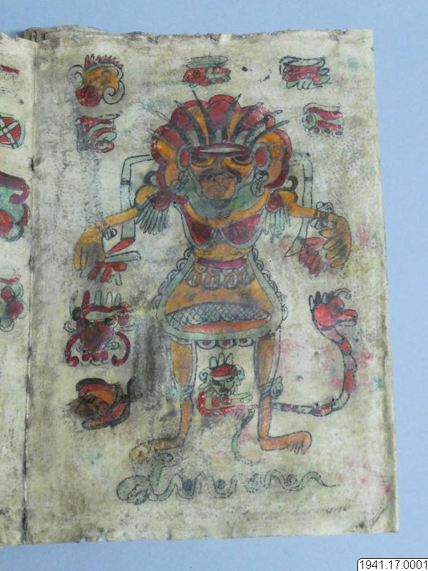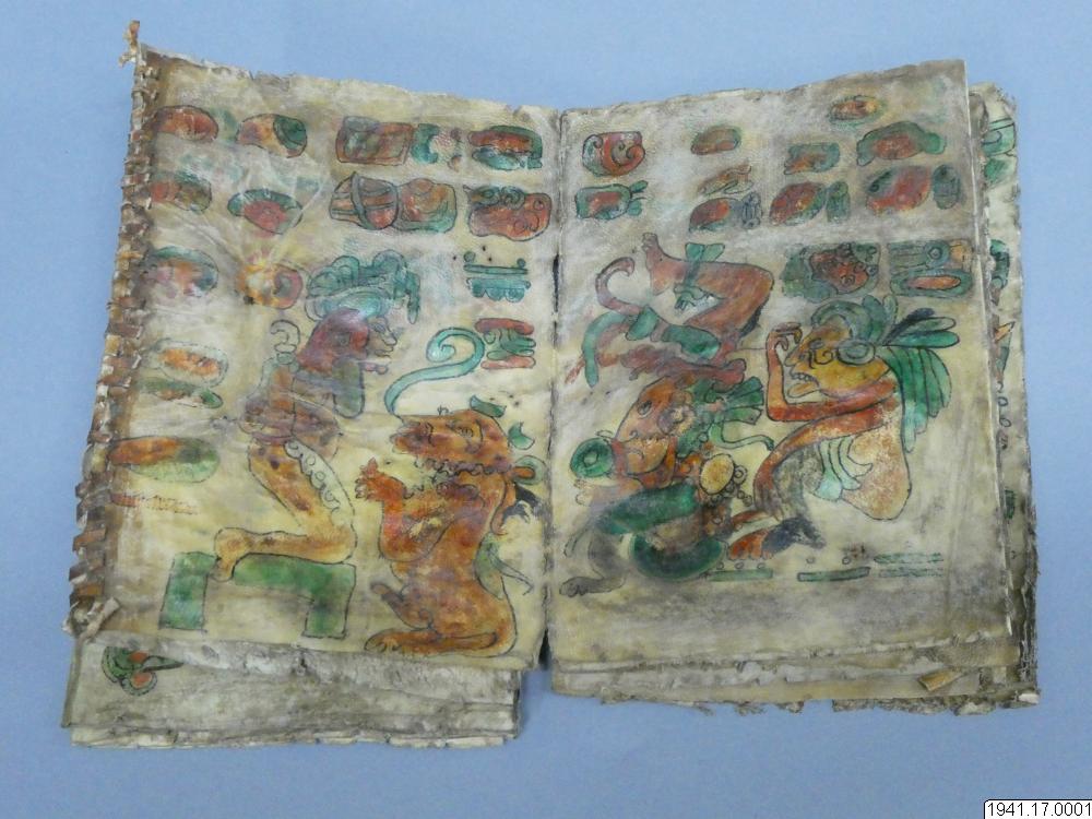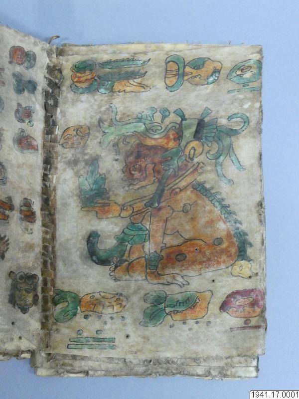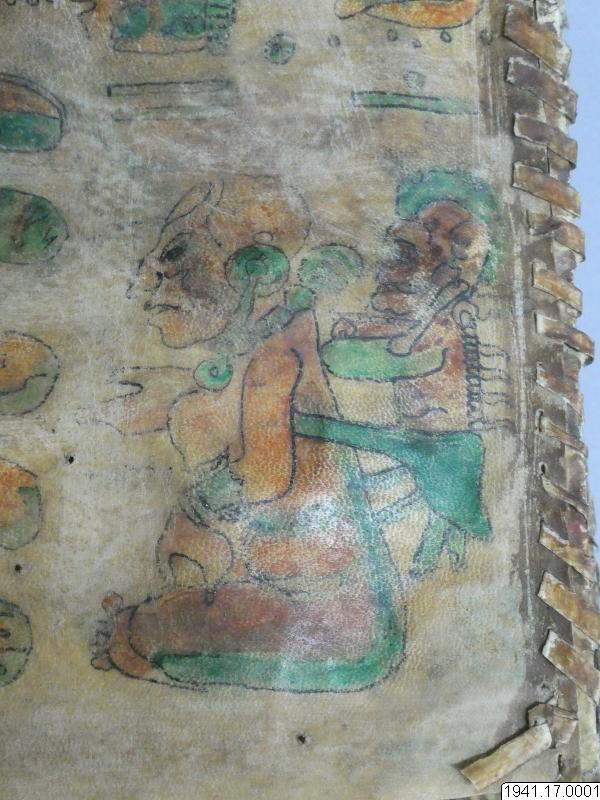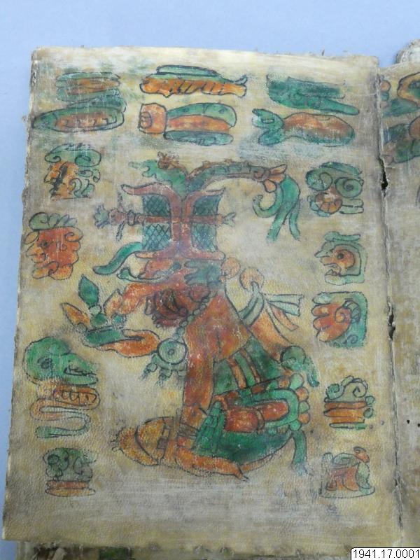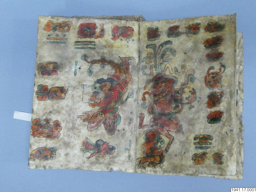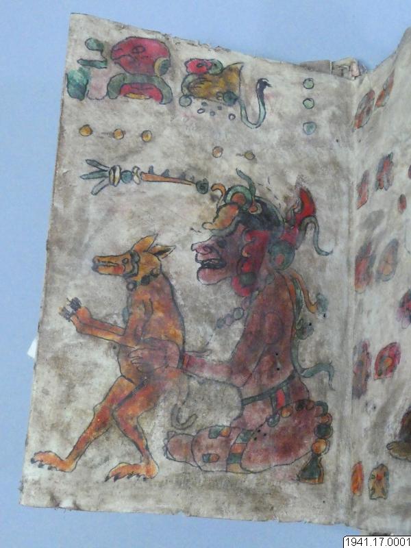 Med figurer och datumhieroglyfer m.m. målat dokument på skinn om 20 veckade och hopfasta blad (40 sidor) i storlek c:a 15,5 x 17 cm. Se vidstående text!