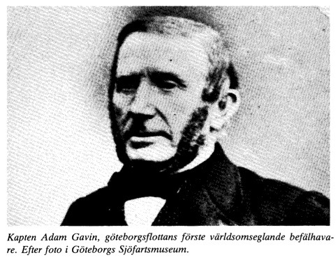 Adam Richard Gavin, född 12 oktober 1815, död 26 november 1900, sjökapten. År 1829 gick han till sjöss som kajutvakt i briggen Venus som tillhörde James Dickson & Co. Efter 4 resor med detta skepp i diverse olika positioner tog han sjökaptensexamen av första graden och fick därefter burskap i Göteborg den 6 december 1839. Hans första fartyg som befälhavare blev den nybyggda barken Caledonia som också tillhörde James Dickson & Co. Under den första resan som påbörjades i slutet av juli 1840 gick han på grund vid Maplin Sands i Themsenmynningen och förlorade ankare och kättingar. Låg kvar i London till nyårsafton då avgång till Cadiz skedde utan last. Där lastades salt för New Orleans, varifrån Caledonia återvände med tobak, bomull och färgträ. Återkom till Göteborg den 8 augusti 1841. Den 31 oktober samma år gavs sig Adam Richard Gavin iväg på en världsomsegling som befäl på Caledonia. Caledonia anlöpte på utresan Portsmouth i England samt Kapstaden som lämnades den 19 mars 1842. Ankomsten till Sydney skedde den 14 maj samma år. Gavin anlitade agenten A.B. Spark för försäljningen av större delen av lasten.