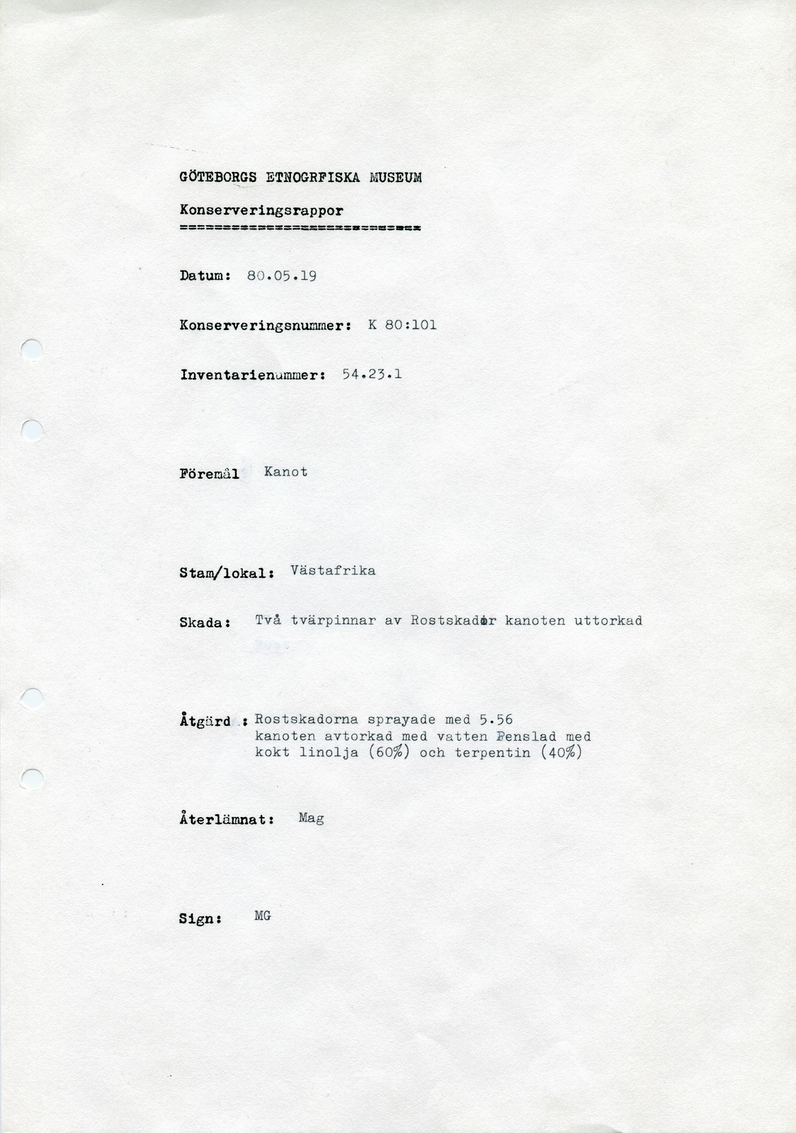 - Konserveringsrapport, Göteborg etnografiska museum (GEM).