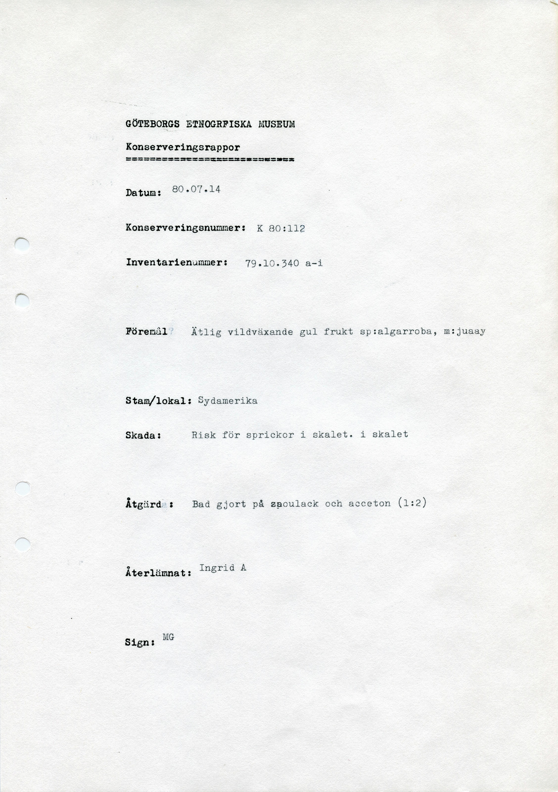 - Konserveringsrapport, Göteborg etnografiska museum (GEM).