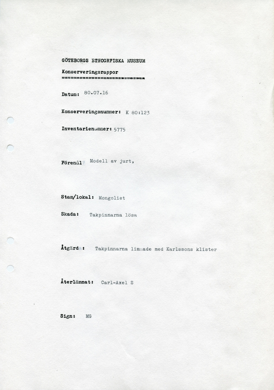 - Konserveringsrapport, Göteborg etnografiska museum (GEM).