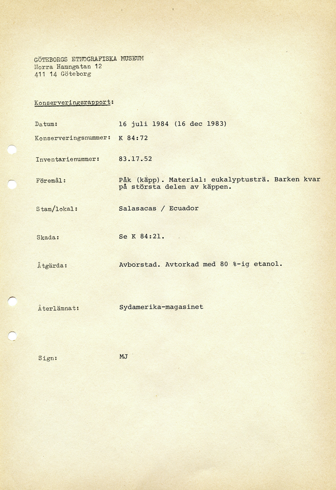- Konserveringsrapport, Göteborg etnografiska museum (GEM).