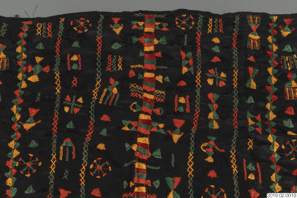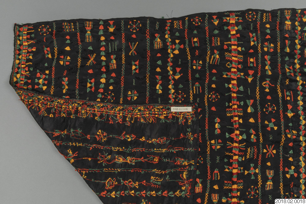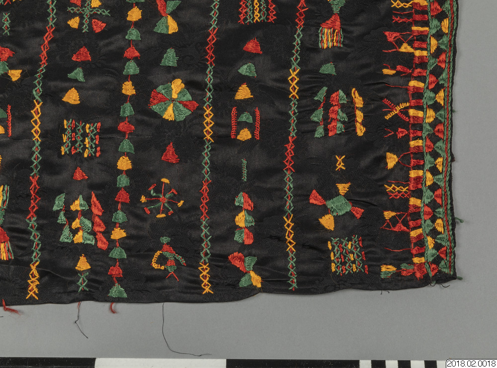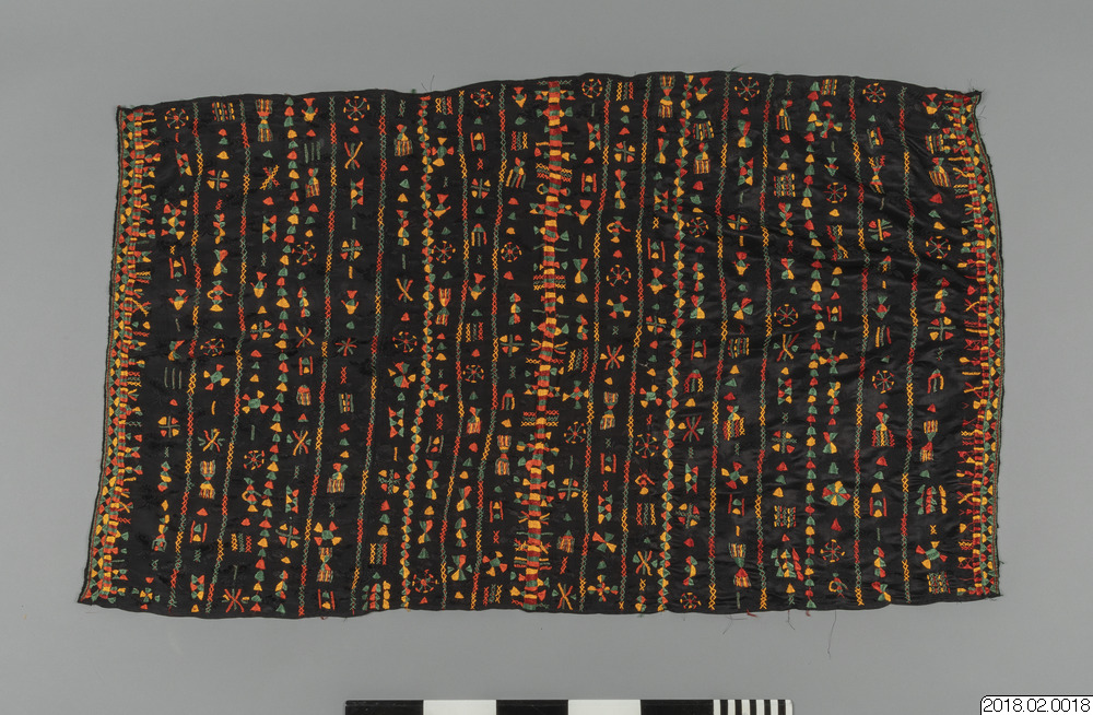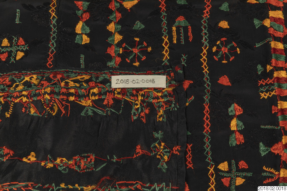 - Brudschal, svart tyg botten, Traditionell broderi i orange, zvart, rött/brun, gul