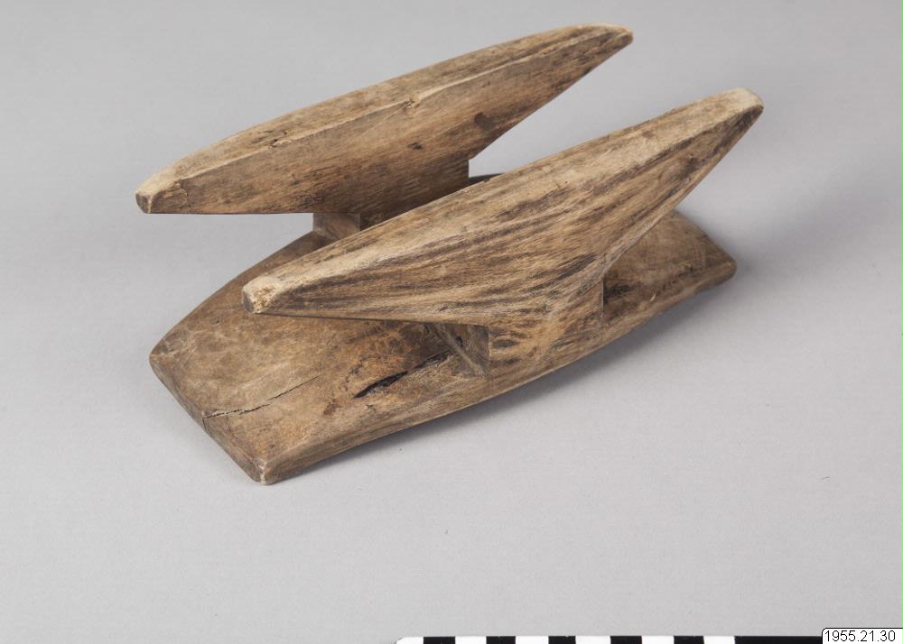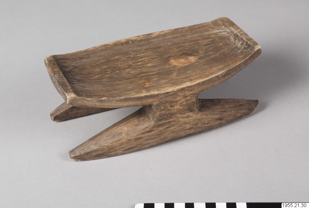 > (=sjunger besvärjelser) sitter han på en pall som denna och har till hjälp stavar, lansar och stundom ormfigurer och annat. Vid besvärjelsen stryker sångaren-medicinmannen med staven över kroppen på den sjuke. Även en pall som denna inviges speciellt, det fanns härför en särskild sång som Olegario nynnade melodieen till, men utan ord. (katalogkort/originalbeskrivning)