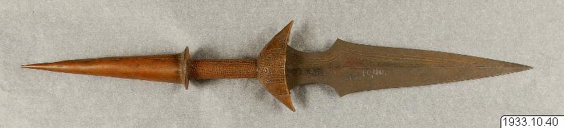 "Knife - central Congo: possibly Batetela or Bankutshu." (Leon Siroto, juli 1958.) (katalogkort/originalbeskrivning)