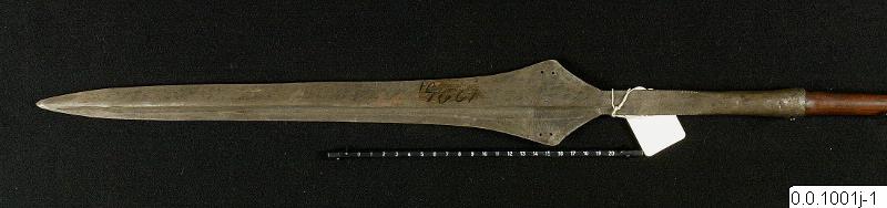 Spjut. Med spets av järn och metallbeslaget snidat skaft.