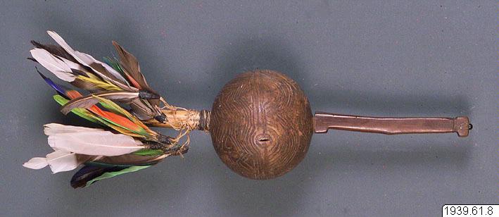 Vackert utskuren kalebasskallra /"maraca"/ med träskaftet prytt med fjädrar.