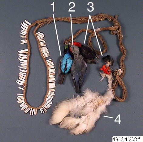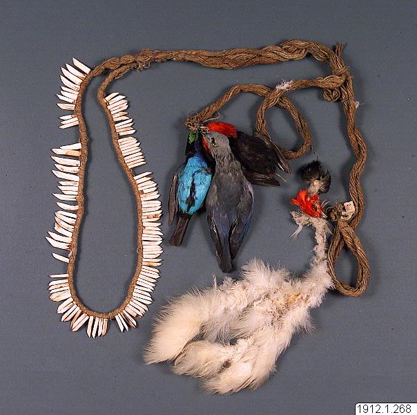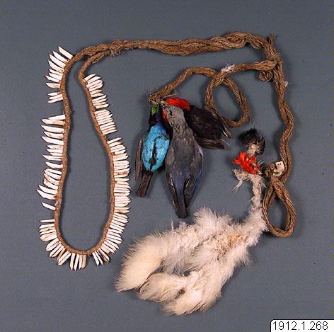 - Halsband, stort, av genomborrade vildsvins- ("pokra-") tänder fästa vid bomullsband. Hängprydnad av kolibri och vildand ("maikwa") (katalogkort/originalbeskrivning)