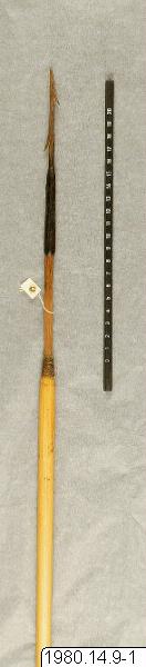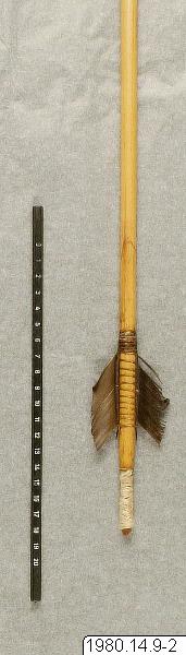- Jaktpil, aramí, med metallspets, försedd med två hullingar. Jfr även 1980.14.0007. Längd: 124cm. (katalogkort/originalbeskrivning)