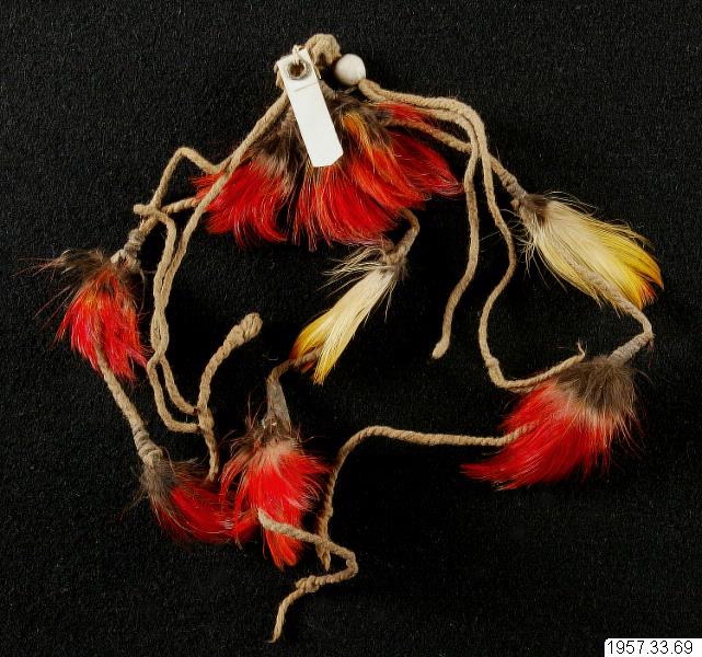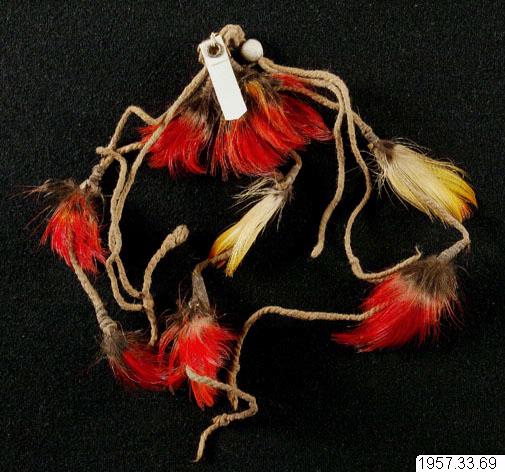 Fjäderprydnad bestående av tre snoddar tofsvis anordnade fjädrar (röda och gula). På en snodd sitter ett frö, som förefaller vara exemplar ac Coix lacrima. Inga uppgifter i originalkatalogen med det låg tillsammans
