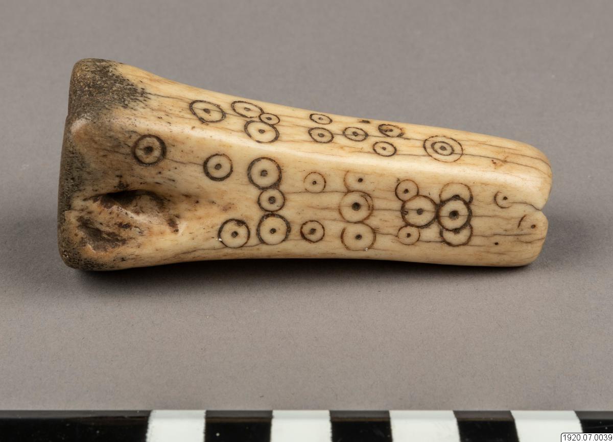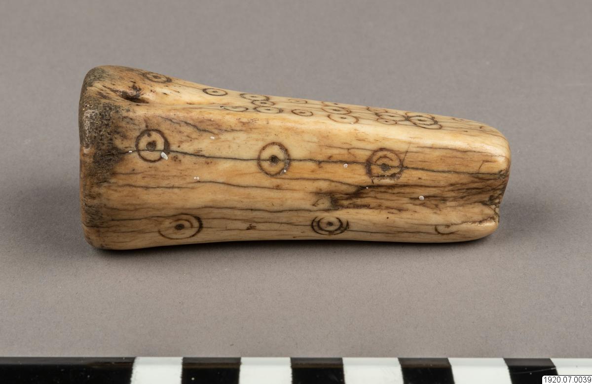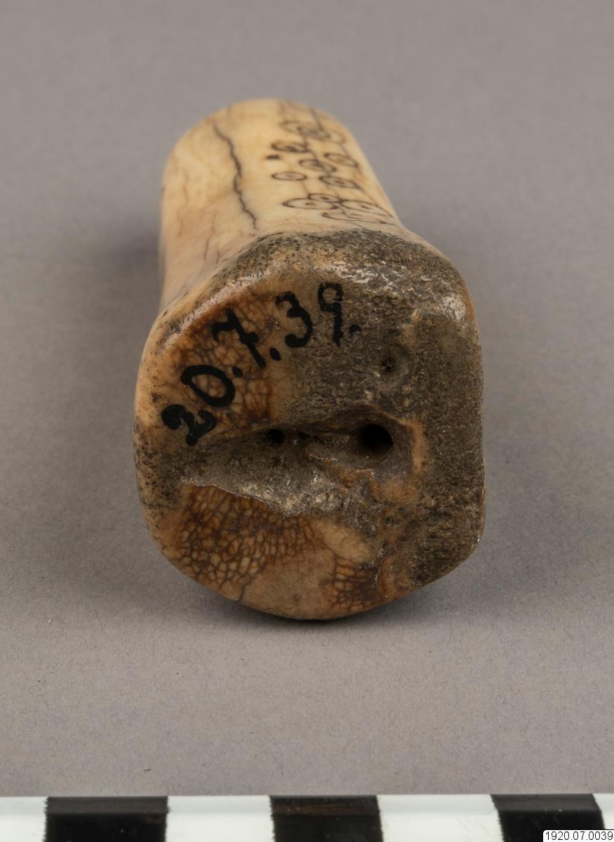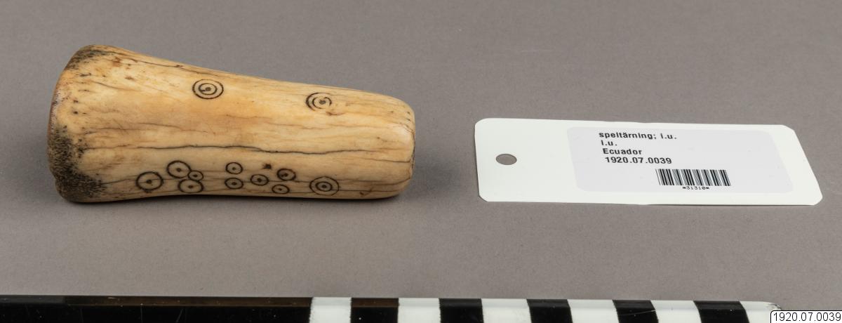 - Speltärning (huayru). Enl. säker bestämning av prof. L.A. Jägerskiöld, gbg., proximala ändan av höger kanonben av ko. (katalogkort/originalbeskrivning)
