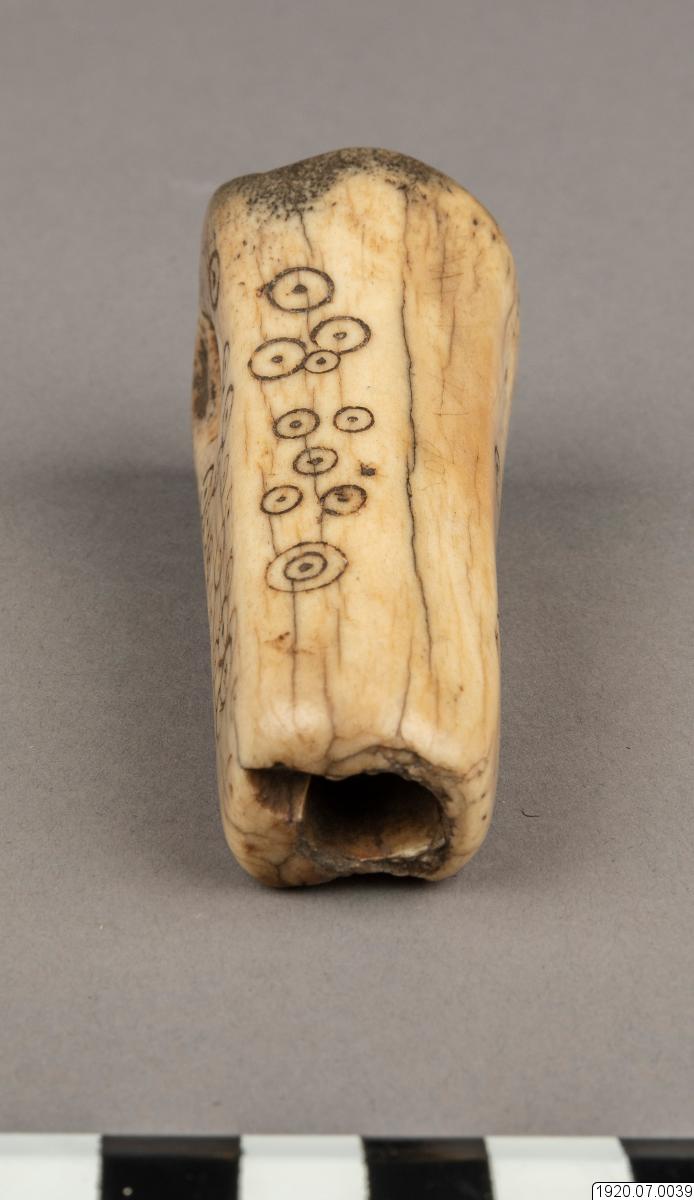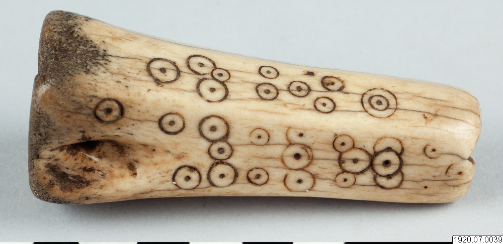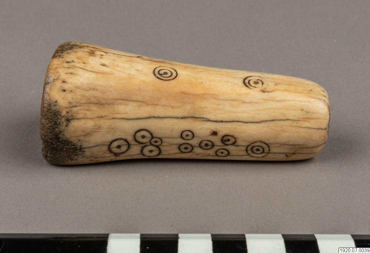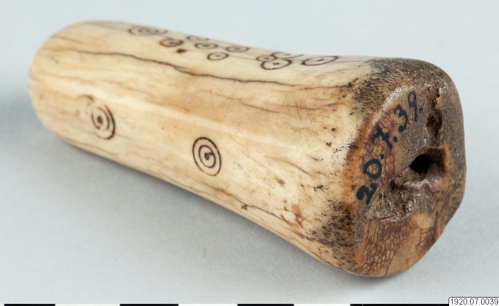 - Speltärning (huayru). Enl. säker bestämning av prof. L.A. Jägerskiöld, gbg., proximala ändan av höger kanonben av ko. (katalogkort/originalbeskrivning)