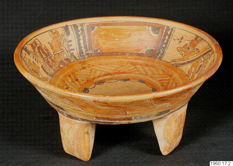 märkes två motsatta fält vardera med samma figurkomposition. Denna figurkomposition visar dels två mot varandra vända personer, som synas bära fjäderutstyrsel el.d. på ryggen, dels ses en maskerad människa, möjligen av typen "jaguarkrigare", vars ansikte tittar fram under en mask. Orig.nr. i samling är 347. - Utvändigt på skålen mellan ett av benparen har ett djurhuvud med gapande mun formats som ett från kärlväggen utskjutande "knopp".