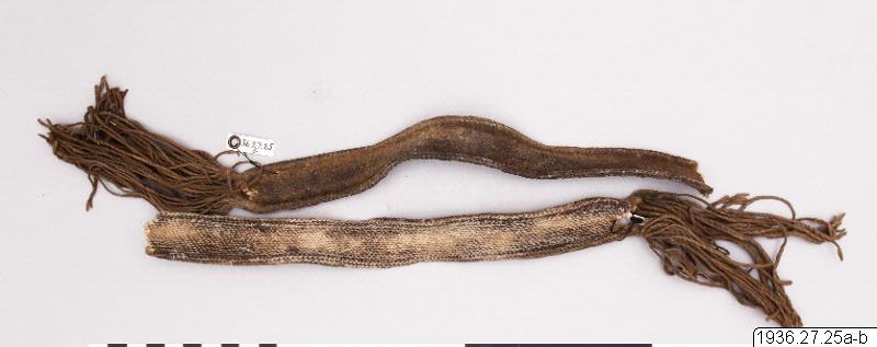- Ett par knäband för en man. Flätas på sin plats, och måste därför vid avlägsnandet skäras sönder liksom de övriga prydnaderna av detta slag i samlingen. (katalogkort/originalbeskrivning)