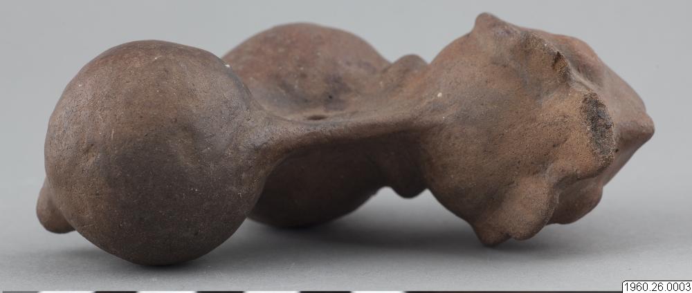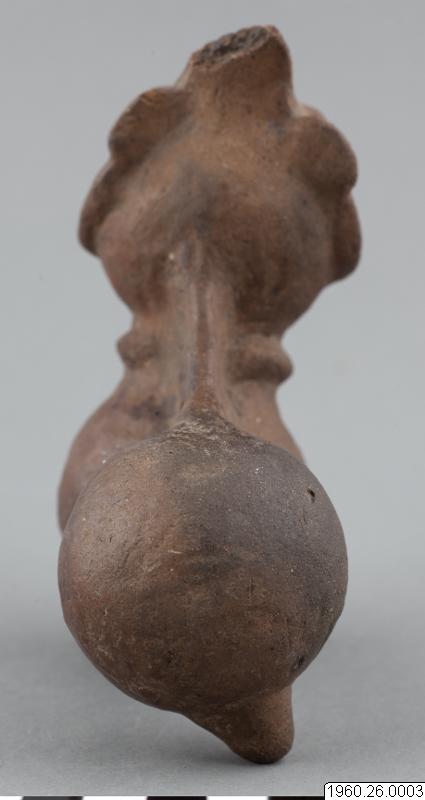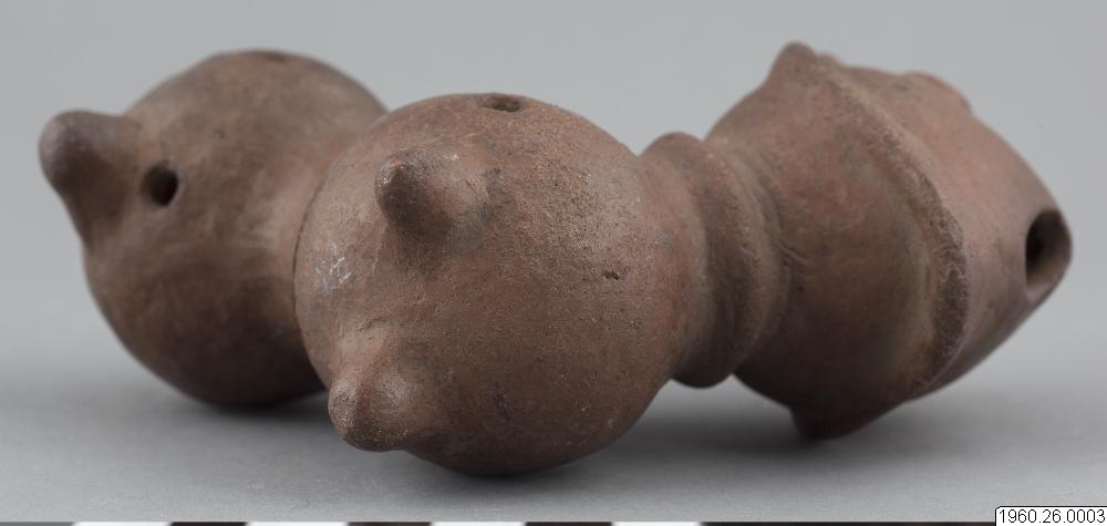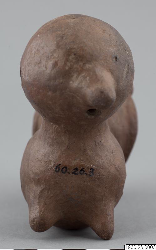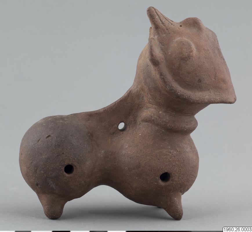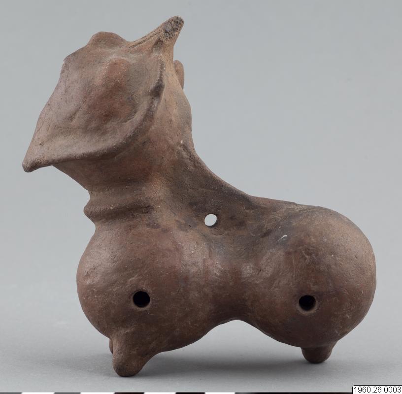fästandet av hjul att dra föremålet med kunnat instickas. Av de tre fötterna sitter två under frampartiet, men endast ett fotstöd under bakre partiet av djuret. Strax vid bakre foten är även ett hål i godset och likaså ett genom ryggen, det senare troligen för en snodd el.d. att bära föremålet i. Synes ej direkt ha kunnat användas som instrument. Originalnr. 723.