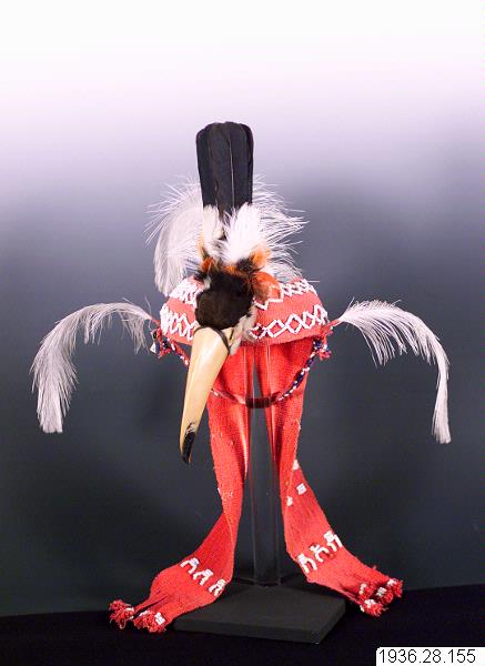 Head dress, headband of red-coloured woolen ribbon with embroidery of white glass or bone beads. The band is attached to the neck and the ends hang down on the back. The loose ends have pearl embroidery in geometric figures in three groups and end with four "fingers" with embroideries at the ends. The headband itself has two longitudinal rows of romance patterns. In the forehead there is a stylized toucan, consisting of the head, some crushed body springs and the tail. The base of the star is covered by some white feathers, probably from some kind of hern. In the neck and the middle of each side are upright long plumes of white feathers from ñandu (american ostrich).