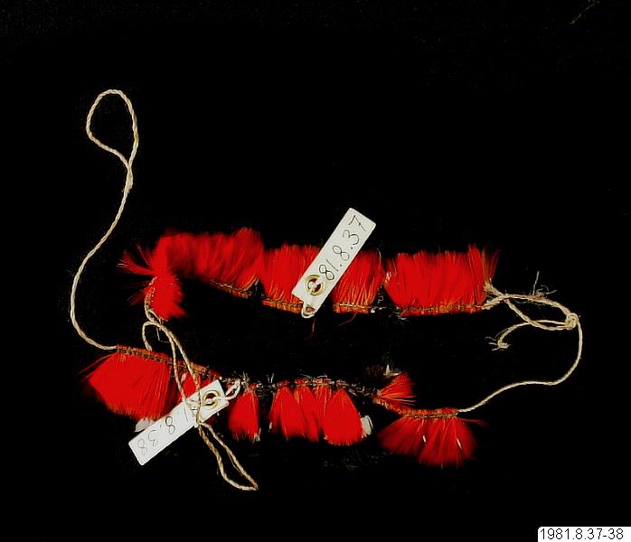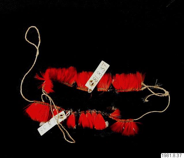 Handledsband av arara-fjädrar (röda) och mutum (svart-vita) för dagligt bruk. Bildar par med 1981.08.0038.