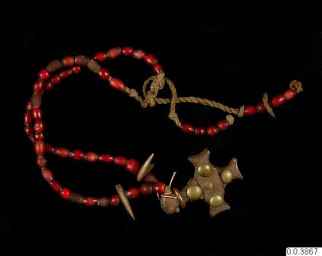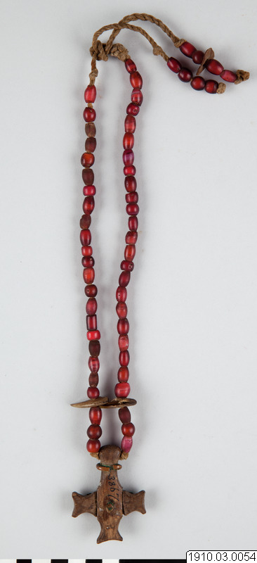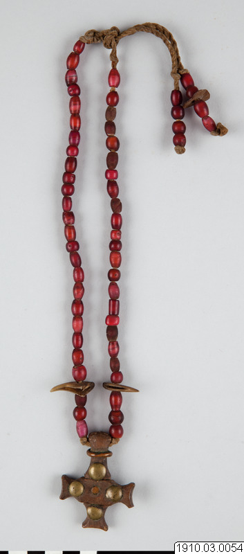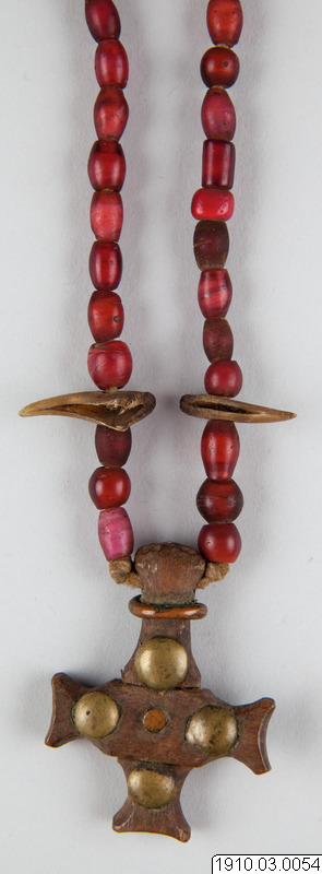 Amulet in the form of a necklace of glass beads with leopard’s claws and a wooden cross. Exactly what the object was used for or symbolised is not known. Like much of the ornaments of the region, it served the dual purpose of being beautiful and communicating with the world of the spirits. From the spirits in the land of the dead, the Kongo took strength, protection and power to cure illness and injury.
