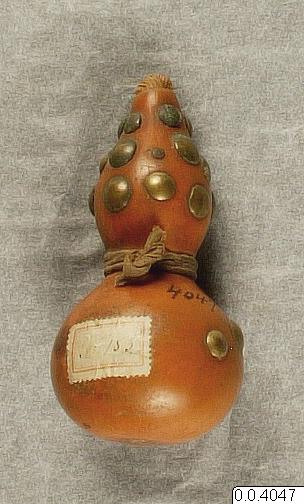 Snusdosa gjord av en kalebass, prydd med mässingsspik. Köpt.