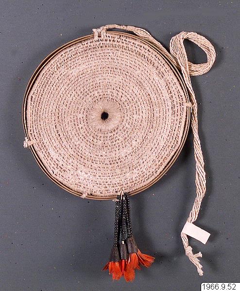 Fjäderhållarskiva (diam. 16,5 cm), enligt samlaren benämnd keikru. Tillverkas av material från palmblad som omlindas med bomullstråd och formar en skiva som i ytterkanterna får en prydnad bestående av frön, frukthylsor och dun från ararapapegojor. Tillverkas av