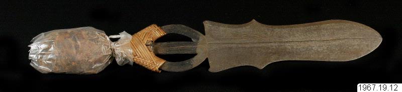 och vinklade mönster. Längslöpande blodskåra. Svärdet kallas enl. saml. Bangalasvärd m. har samlats h. Bapoto.