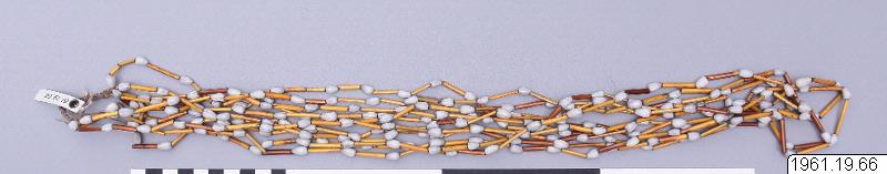 Halsband som omväxlande består av korta stycken av gula orkidéstjälkar och gråvita fröskal. Halsbandet består av flera parallella rader. Höjd (då utsträckt):52 cm.