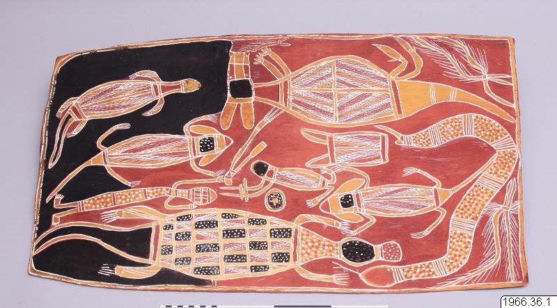 som dök ner i ett vatten, blev först. Han hade med sig ett par käppar för eldborrning. Dessa käppar syns på målningen. En infödd sitter och håller dem. Ödlan blev så arg och förvandlade sig till en människa, så att han kunde hämnas på krokodliens släktingar. Han lyckades med ett spjut och spjutslungare som syns på målningen dödligt träffa kängurun Gardjambul, Barous släktning. Myten slutar med att Barou och hans släktingar förföljer ödlan och dödar denne. Hans kropp är i dag en stenpelare i ett avlägset bergspass. (katalogkort/originalbeskrivning)