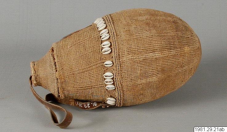 Mjölkkärl bestående av en kalebass överdragen med ett hölje gjort av grovväv. Kärlet är försett med en bärrem av läder. Runt halsen på kärlet sitter en rad kaurisnäckor. Till kärlet hör ett falsat lock av trä.