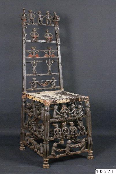 Belgiska Kongo och Portugisiska Angola 11 grader söder om ekvatorn. Stolen är tillverkad hövdingen till ära och skall utgöra en beskrivning på dennes liv allt från födseln. Angende åldern var det omöjligt att erhålla några uppgifter men den hade tillhört förre hövdingen och visste man sedan icke mera. Ännu finns i dessa trakter betydliga mängder etnografiska föremål att erhålla men infödingarna skiljas i högst ogärna vid dem, dock finns alltid möjligheter ifall sprit ingår i bytesvaran. Tjokwe är en mycket ogästvänlig och lömsk stam och tager ogärna emot någon vit man i sin by eller gör något för honom. Man märker väl skillnaden när man kommer från deras grannar Lundastammen som är synnerligen sympatisk och tillmötesgående. Tjokwestammen underkastade sig först 1917 de vita då Belgierna för att klara järnvägen till Katanga sände större vapenmakt. Förut hade en liten garnision uppehållits vid Dilolo Post men denna hade blivit inringad och räddades då. Stolen stod i hövdingens hydda när Clarence Lyon fick se den år 1929 i dec. när han var på väg från Katanga till Labito Bay