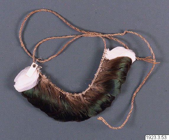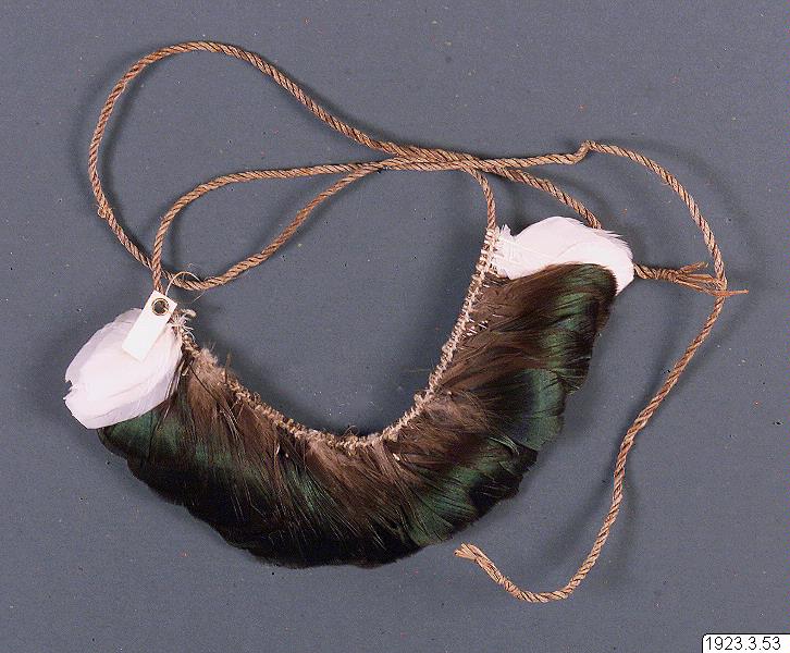 - Smalt diadem av mörka fjädrar. Diadem som detta bars vanligen av de unga männen vid anfallen. (katalogkort/originalbeskrivning)
