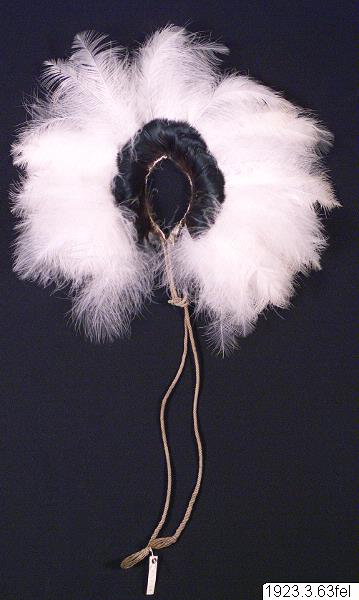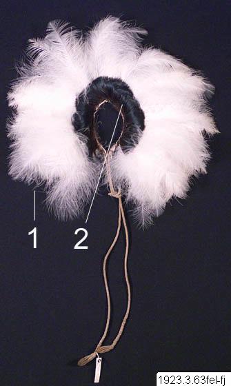 - Två olika föremål, på varsitt katalogkort, med samma nummer. Det ena med, det andra utan svarta fjädrar. Fotot avbildar föremålet med svarta fjädrar, eftersom det dokumenterades först. På katalogkortet till detta föremål står de ursprungliga numren som "23726" och "23.3.64", fast de är senare ändrade till "23725 ?" och "23.3.63". Föremålet 1923.03.0064 har fått sitt nummer i efterhand och kan också vara inblandat i den här lilla härvan. /JO