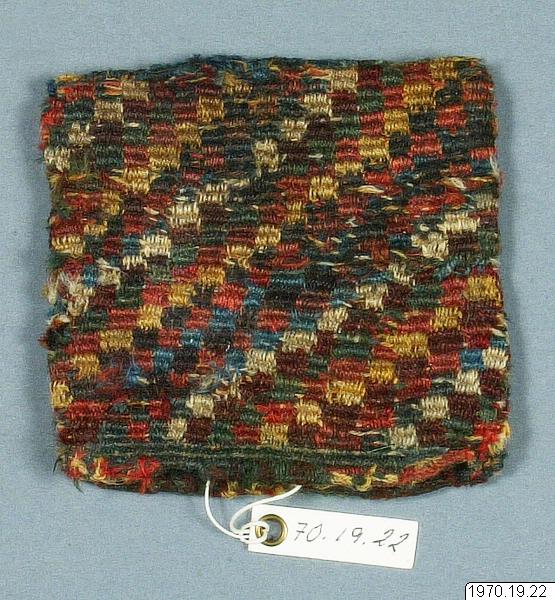 Väska, 9 x 9,5 cm. Av garn, flerfärgad. Väskan har efter analys beskrivits av fru M.Anker i GEM på följande sätt: "Spiralteknik". Färger: Blå, vit, rosa, gul, röd-brun, mörk-grå, grön." Väskan som är gjord i spiralteknik (coiled) har en stomme av ullgarn i de olika färgerna och
